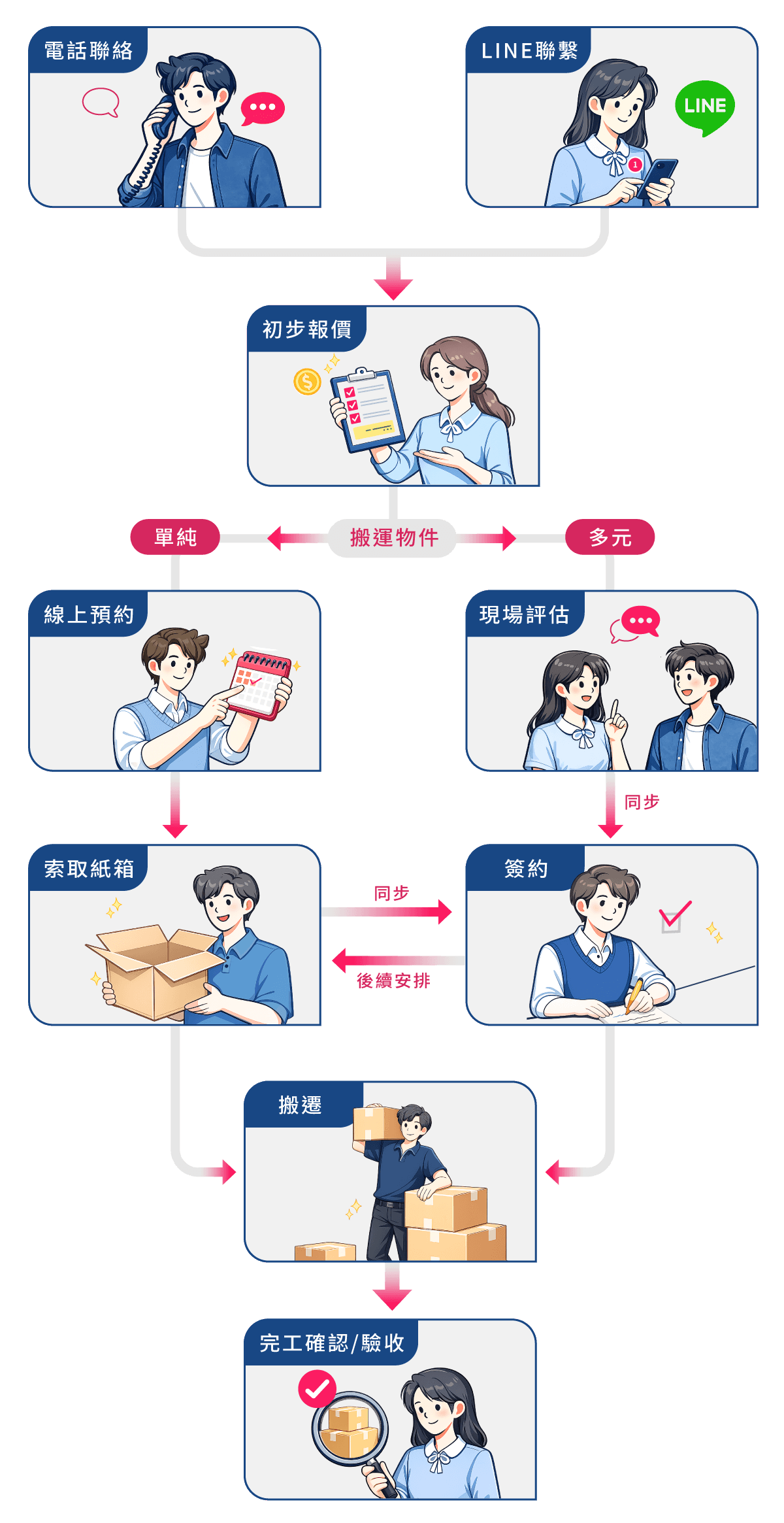 我們的資深估價師會依據您提供的資訊如現場環境、物品箱數、樓層及梯間狀況,仔細評估打包所需搬遷器具、車輛等,並依據討論內容提供初步報價。